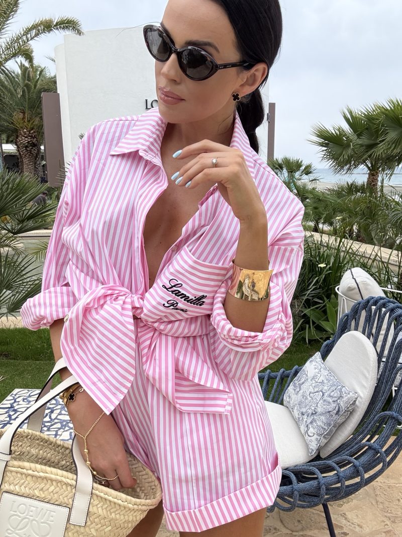 Valmistatud ilusast triibumustriga kangast. Võluv tasku tikitud logoga.