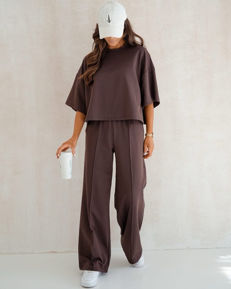 Lühike pluus ja kõrge vöökohaga taskuga püksid. Elastne materjal